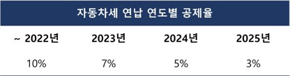자동차세 연납 할인율이 2023년부터 3%나 줄어들었습니다. 2020년도까지는 고정적으로 10%를 할인해 줬지만 2021년부터는 지방세법이 개정되면서 계산식을 통해 최대 10% 범위 내에서 공제되는 것으로 바뀌었습니다. 연도별 공제율은 2022년까지는 10%였지만 올해 2023년에는 7%, 2024년에는 5%, 그리고 2025년에는 3%까지 계속 감소한다고 합니다.